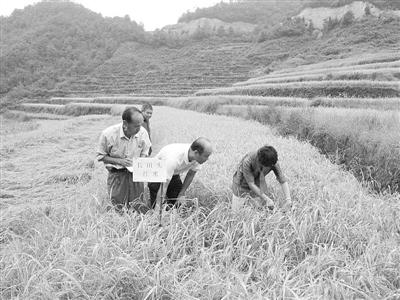 宁波市农科院高级农艺师、农业科技特派员安学君(右一)指导宁海桑洲镇农户种植红米受访者供图 典型派 本报记者 江 耘 通讯员 王虎羽 在浙江宁波奉化溪口镇锦溪村海拔530米的山冲里,