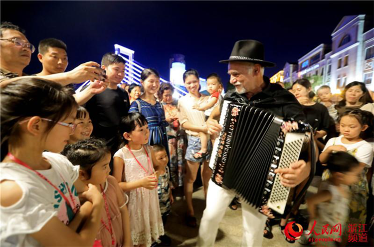 夏夜降临,灯光璀璨,宁波老外滩国际时尚人文街区弥漫着奢华与浪漫的气氛。留着花白胡须的西班牙艺术家Jon,背着他的意大利原装手风琴,准时出现在这里。作为宁波首批街头持证艺人,他要用优美的琴声,为来来
