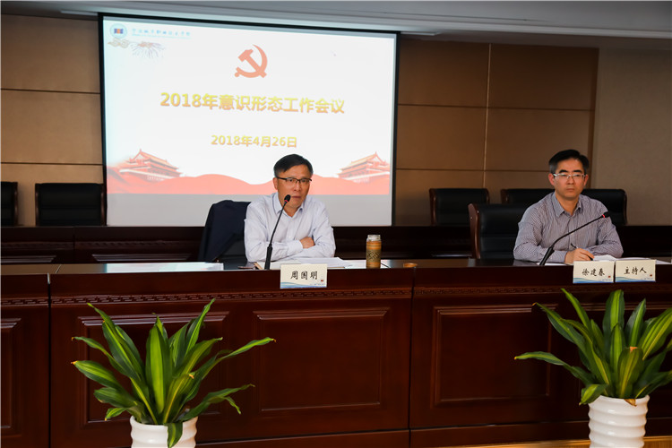 4月26日下午,学校2018年意识形态工作会议召开。党委委员、纪委书记徐建春主持会议,党委书记周国明作讲话。全体校领导、中层干部、协理岗位人员参加了会议。 会上,周国明传达了宁波市委教育工委关于