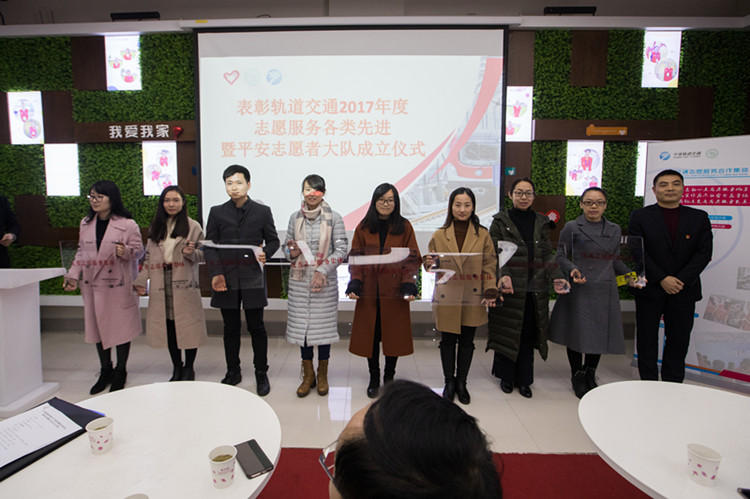 1月17日,宁波轨道交通集团在2号线鼓楼站举行了宁波轨道交通2017年度志愿服务各类先进表彰大会暨平安志愿者大队成立仪式。我校应邀参加了本次活动。 仪式上,我校作为受表彰的八家宁波企事业单位之一