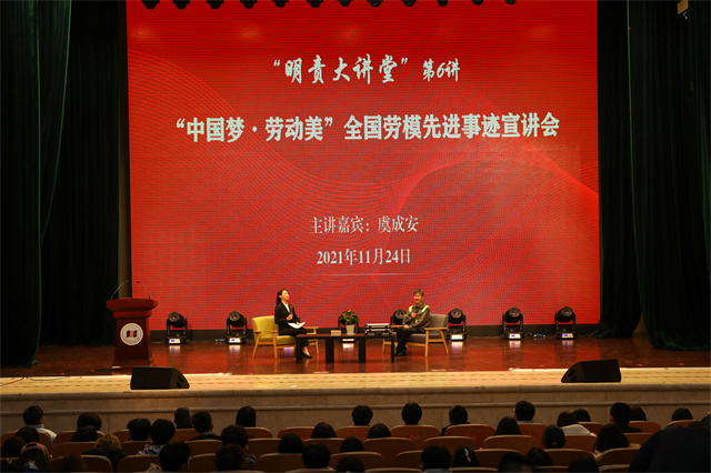 11月25日下午,我校明责大讲堂第六讲“‘中国梦·劳动美’全国劳模先进事迹宣讲会”在综合楼礼堂举行。全国劳动模范、“全国五一劳动奖章”获得者、宁波甬港拖轮有限公司电器主管、船舶电气设备维修“达人”虞成