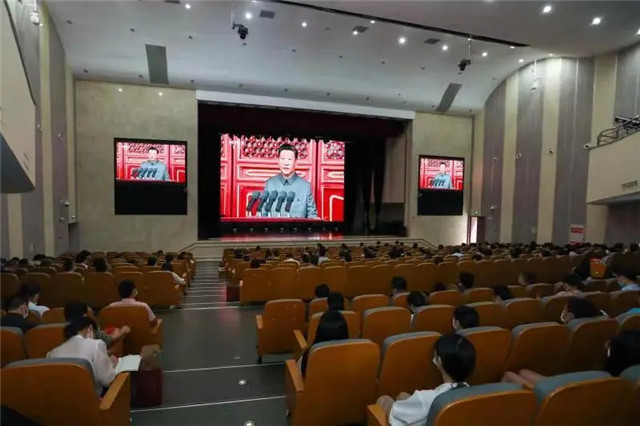 7月1日上午,庆祝中国共产党成立100周年大会在北京天安门广场隆重举行。中共中央总书记、国家主席、中央军委主席习近平发表重要讲话。我校组织全体师生党员在大礼堂集中收看大会直播,认真学习习近平总书记重要