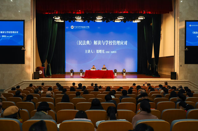 12月23日下午,学校举行党委理论学习中心组(扩大)学习会暨普法教育讲座,宁波大学经济法与环境法研究所所长、二级教授郑曙光应邀来校做题为《〈民法典〉解读与学校管理应对》的专题讲座,党委书记周国明主持会