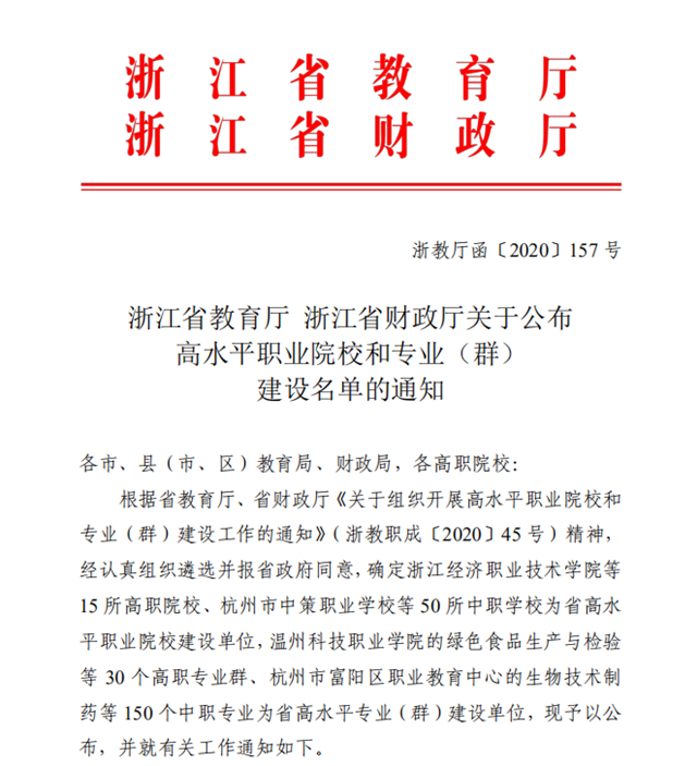日前,根据省教育厅、省财政厅《关于组织开展高水平职业院校和专业(群)建设工作的通知》(浙教职成〔2020〕45号)精神,经认真组织遴选并报省政府同意,确定15所高职院校、50所中职学校为省高水平职业院