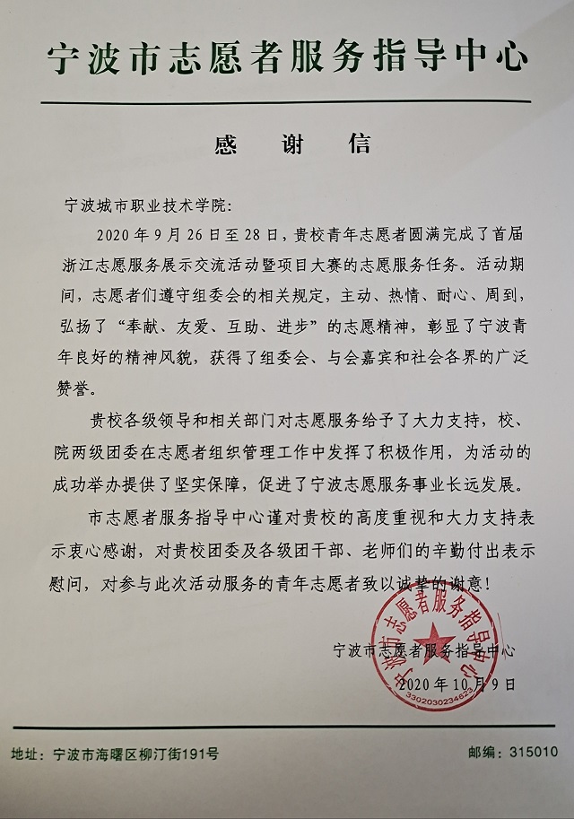 近日,我校收到一封来自宁波市志愿者服务指导中心的感谢信,信中对我校青年志愿者在服务“首届浙江志愿服务展示交流活动暨项目大赛”中的优异表现进行充分肯定与赞扬,并对我校高度重视与大力支持本次活动表示感谢。