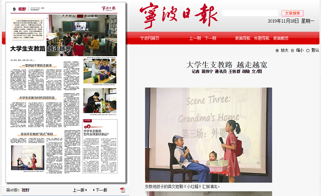 支教地孩子的英文短剧《小红帽》汇报演出。 贵州册亨实验小学(纳福校区)孩子们与宁波孩子们视频连线。 宁波财经学院支教团队正在训练孩子们垃圾分类。