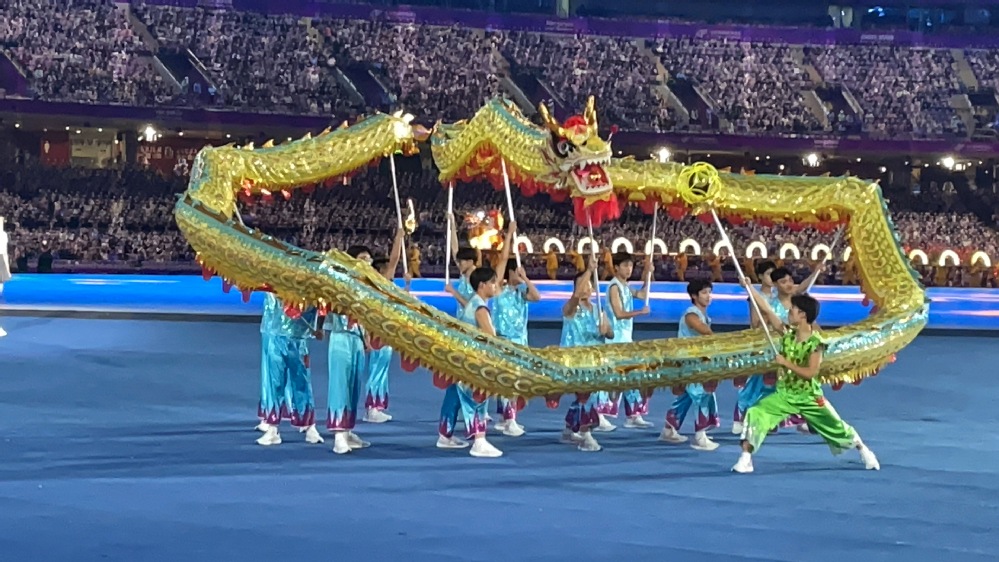 在开幕式前的暖场压轴节目“力量”中,伴随着气势磅礴的配乐,杭州奥体中心体育场内,奉化布龙和其他8条来自不同地域的 “龙”一起闪亮登场:龙游四海、蛟龙翻腾、翻江倒海、穿越腾龙......毛剑波老师和伙伴们的精湛表演,惊艳了全场观众。