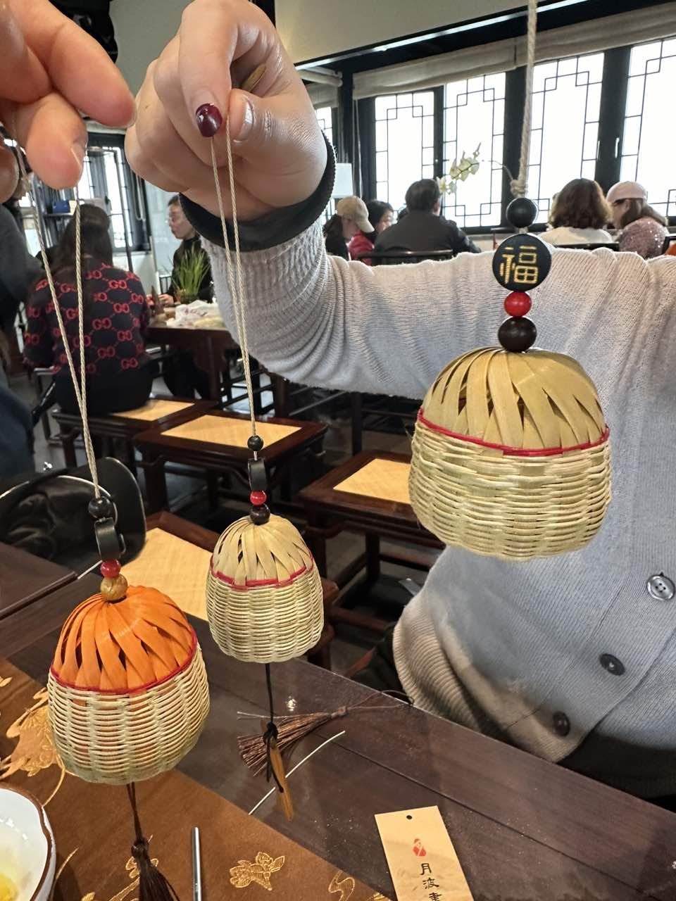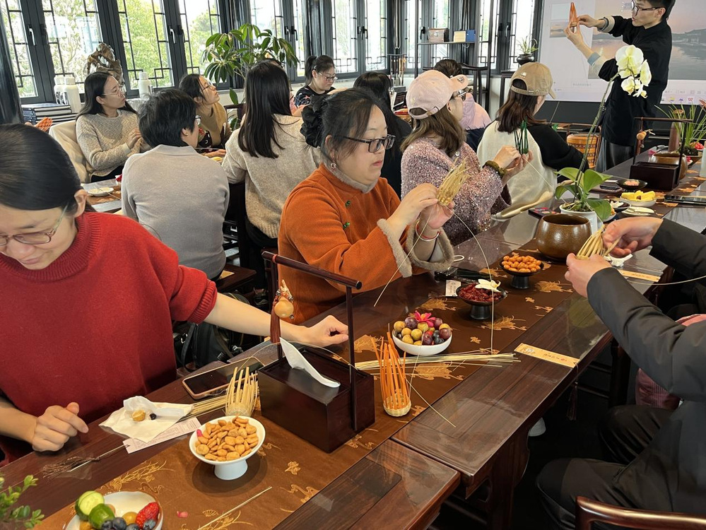 女性教职工在月波书楼二楼体验了宁波市非遗项目—竹编香囊。不仅对这项非遗文化有了更深的理解,也在动手过程中享受着制作的快乐。
