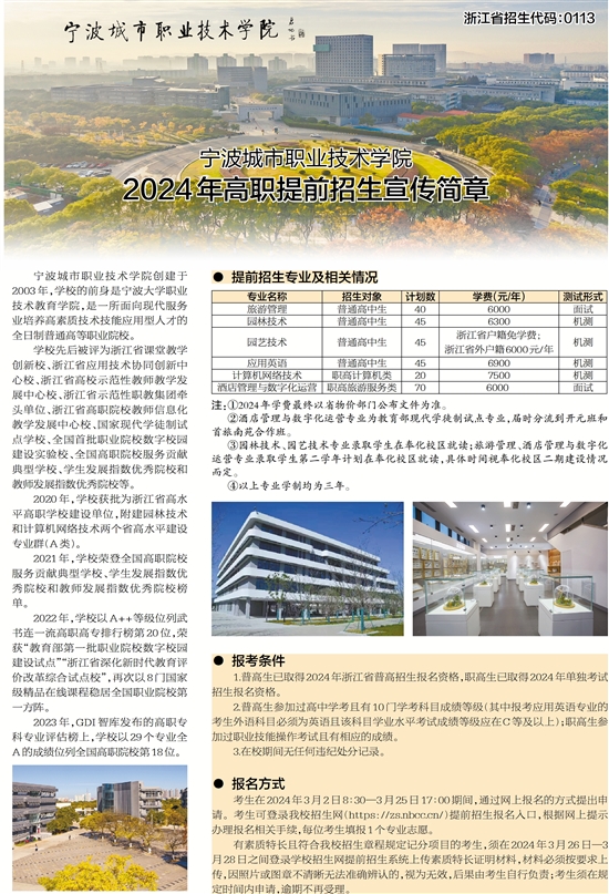 考生在2024年3月2日8∶30-3月25日17∶00期间,通过网上报名的方式提出申请。考生可登录我校招生网(https://zs.nbcc.cn/)提前招生报名入口,根据网上提示办理报名相关手续,每位考生填报1个专业志愿。
