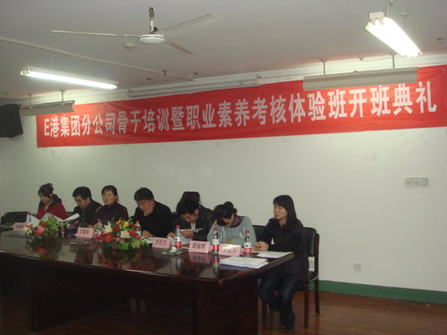 11月22日, E港集团召开“分公司骨干培训暨职业素养考核体验班开班典礼”。高职教育研究中心主任王孝坤等七名培训教师、集团的各分公司执行经理、副经理、工会主席等参加典礼。