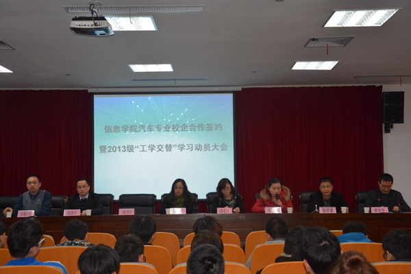 12月30日下午,信息学院在图书馆报告厅举行了该院汽车专业与在甬8家知名车企的校企合作签约仪式暨2013级“工学交替”学习动员大会。信息学院领导,相关企业负责人以及13、14级汽车专业学生出席了签约仪式。