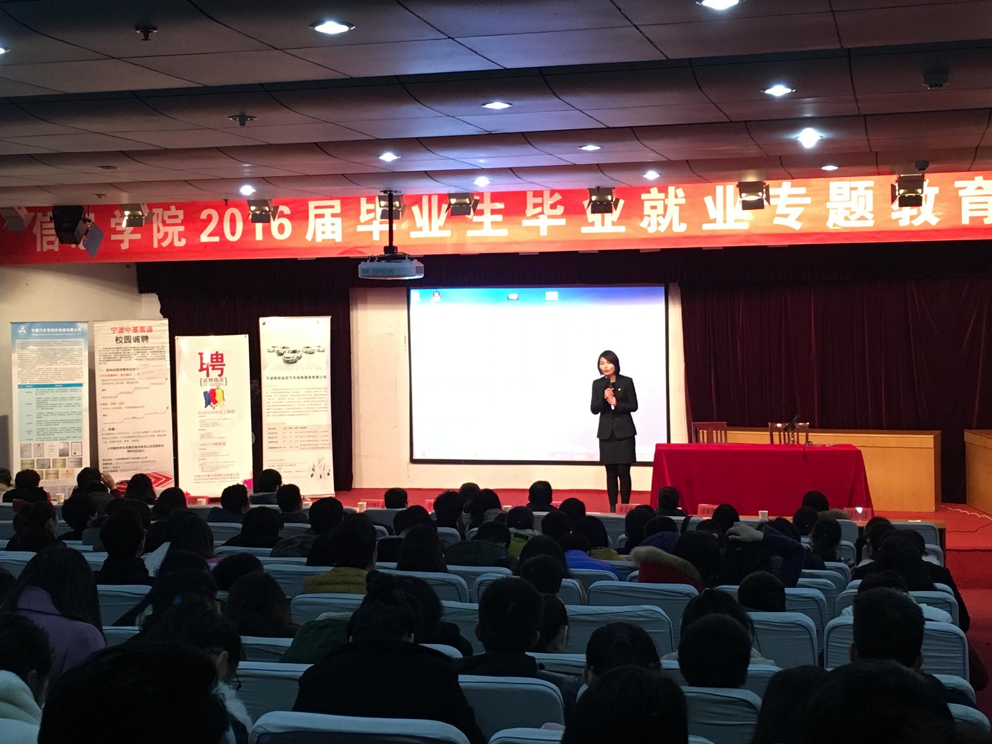 12月30日,信息学院企业联合宣讲会在红色报告厅如期举行,宁波华讯通信服务有限公司、宁波高欣信息科技有限公司、宁波利之星汽车有限公司等近二十家企业来校开展宣讲。学院领导、班主任、相关辅导员及495名应届毕业生参加了此次宣讲会。在会上,各个公司负责人向在场的学生分别介绍了各自的企业文化、战略规划和企业未来发展目标,提出了岗位需求、岗位发展前景及岗位相关福利等,罗列了各公司的选人标准(能吃苦、素质高、悟性好、反应快等),各个公司负责人还强调了企业核心价值观,并对在场学子提出了殷切的希望。