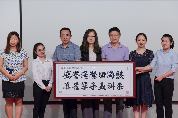 分享会上,中德诺浩(北京)教育投资股份有限公司中东大区首席代表杨晓琴女士首先致辞。杨女士在致辞中回顾了中德诺浩在华办学所取得的巨大成就,并高度评价了学院领导、汽车专业教师对的合作项目大力支持,同时对宁波城市职院所有在校在读汽车专业的同学提出殷切期许。随后,2014级中德诺浩项目毕业生代表王钰莹、连佳超先后分享了自己在读期间所学所想与入职以来的心得体会。接着,毕业生向母校赠送了题为“盛譽遙驚四海駭,慕名學子五洲來”的匾额和题为“春播桃李三千圃,秋来硕果满神州”的字画;最后,信息与智能工程学院汽车检测与维修专业负责人李建兴老师对毕业生送出毕业寄语,信息与智能工程学院院长徐济惠老师作了总结发言。