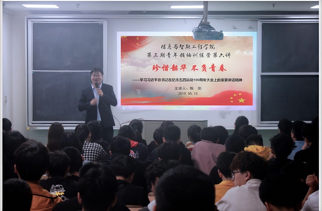 全国上下热议习近平总书记在纪念五四运动100周年大会上的重要讲话之际,信息与智能工程学院团总支于5月15日在1-104教室开展第三期“青年领袖”训练营第六讲,邀请学院青马工程结对的专业导师陈剑,做了题为《珍惜韶华不负青春——学习习近平总书记在纪念五四运动100周年大会上重要讲话精神》的专题讲座,学院团总支、学生会、自管会三大组织共118名学生干部参与此次学习活动。