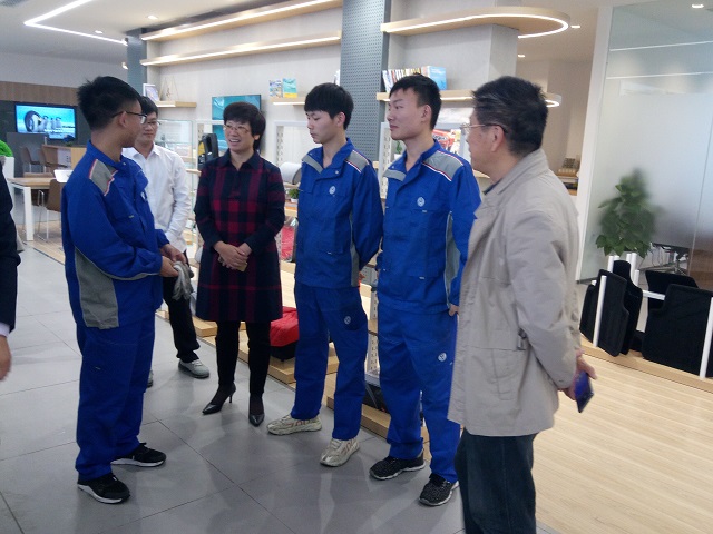 潘菊素一行看望了在腾峰集团上汽大众、斯柯达、荣威、名爵等品牌4S店在岗锻炼的各位同学,询问了同学们的学习锻炼状况,勉励他们把握机会,在企业要努力、踏实地学习,同步提高理论与技能水平,不怕吃苦,再接再厉,做出成绩。