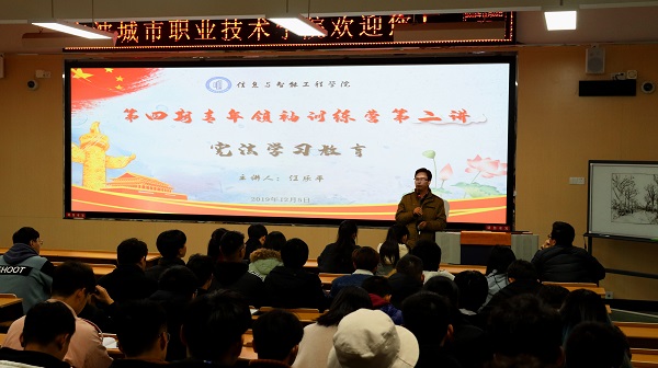 为进一步弘扬宪法精神,增强我院学生干部的法制意识,12月5日晚,信息与智能工程学院以“宪法宣传日”为契机,在3-109教室组织开展主题为“宪法学习教育”的第四期青年领袖训练营第二讲。此次青训营由院团总支书记张林伟主持,特邀院党总支书记江乐平主讲,学院团学自三大组织全体学生干部参加。