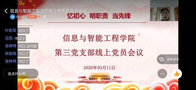 3月11日,信息与智能工程学院第三党支部线上党员会议通过钉钉直播的形式召开,第三党支部书记孙小妮老师、组织员王同祎老师及全体学生党员,共33人参加本次大会。