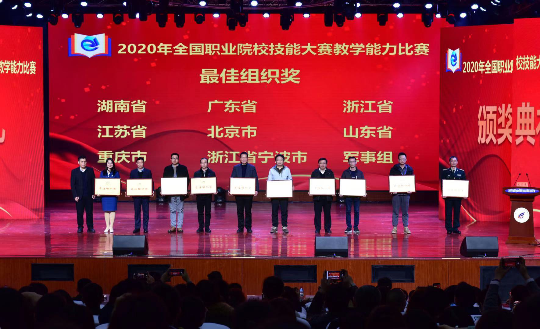 据悉,全国职业院校教学能力比赛是教育部举办的唯一全国性的教师比赛,从2020年教学能力比赛呈现的内涵来看,比赛特别强调职业教育改革政策与要求落地落实、专门关注疫情防控常态化背景下的教学应变能力、扩大考察团队成员课堂讲授与教学研究水平。今年共有来自32个代表队的386个教学团队参加高职组的角逐,最后共评出一等奖40项、二等奖87项、三等奖120项,浙江省高职代表队共获得一等奖6项、二等奖4项、三等奖3项,并荣获“最佳组织奖”。我校作为浙江省高职院校教学能力比赛承办单位,作为浙江省代表队上台领奖。今年大赛首次邀请中国教育电视台拍摄系列视频,落实“永不落幕的技能大赛”要求,实现比赛成果转化和影响力的跃升。