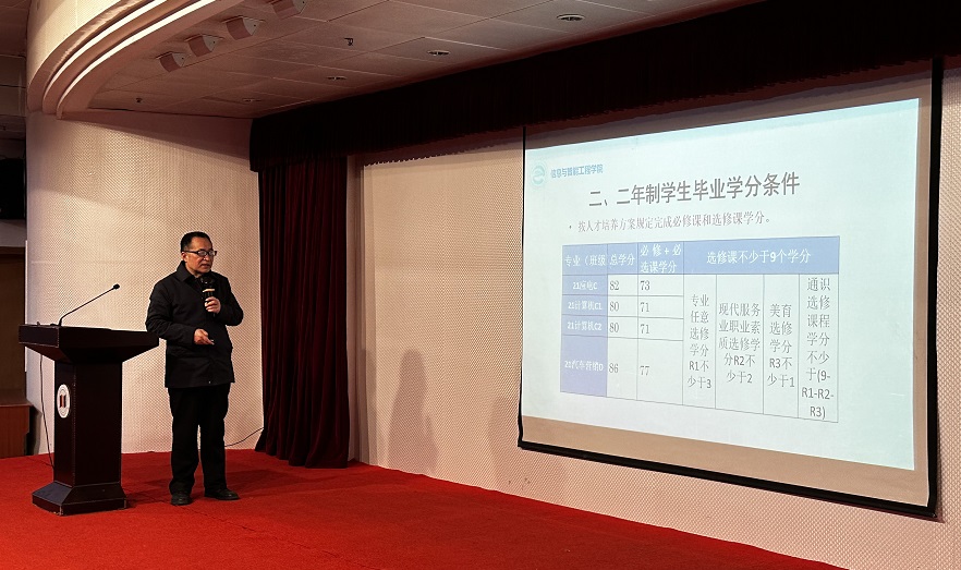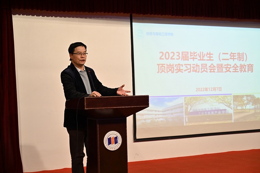 为进一步加强学生顶岗实习行前教育,引导学生顺利实现从学生到员工的身份转变,强化学生实习管理和教育工作,12月7日,信息与智能工程学院召开2023届二年制毕业生顶岗实习动员会暨安全教育。学院党总支书记江乐平、副院长潘世华、全体辅导员、相关班主任及全体2023届二年制毕业生参加会议。