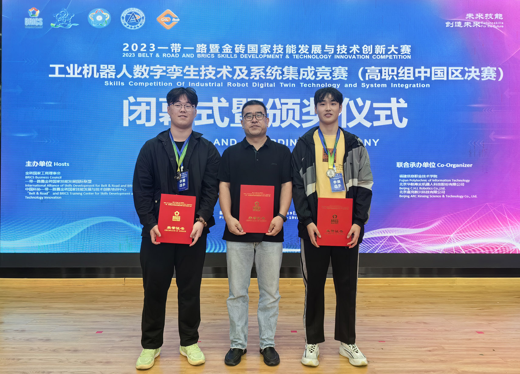 10月17日—19日,2023“一带一路”暨金砖国家技能发展与技术创新大赛工业机器人数字孪生技术及系统集成竞赛(高职组中国区决赛)在福建平潭举行,来自全国各省、自治区、直辖市49支代表队98名选手同台竞技。经过激烈比拼,宁波城市职院信息与智能工程学院教师朱蓉、李均恒指导的豆宇阳、章智翔团队荣获二等奖,学校获得优秀组织奖。