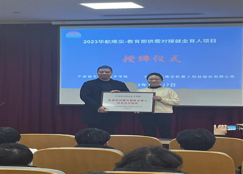 据了解,就业育人项目是教育部贯彻落实党中央、国务院“稳就业”“保就业”决策部署的举措之一,旨在深化高等教育改革,推动就业与培养有机联动、人才供需有效对接。本次项目是教育部高校学生司第二期供需对接就业育人立项项目,由学院智能控制技术专业与北京华航唯实机器人科技股份有限公司合作开展。现场,张微代表华航唯实向信息与智能工程学院副院长万旭成授牌。