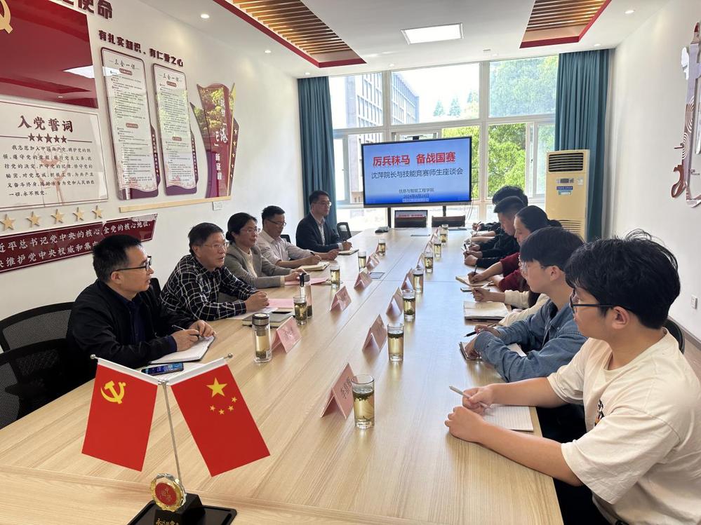 4月24日,信息与智能工程学院在9-209举行技能竞赛国赛动员会,校长沈萍出席并讲话,学院领导班子成员及国赛入围师生团队参会,学院院长徐济惠主持。