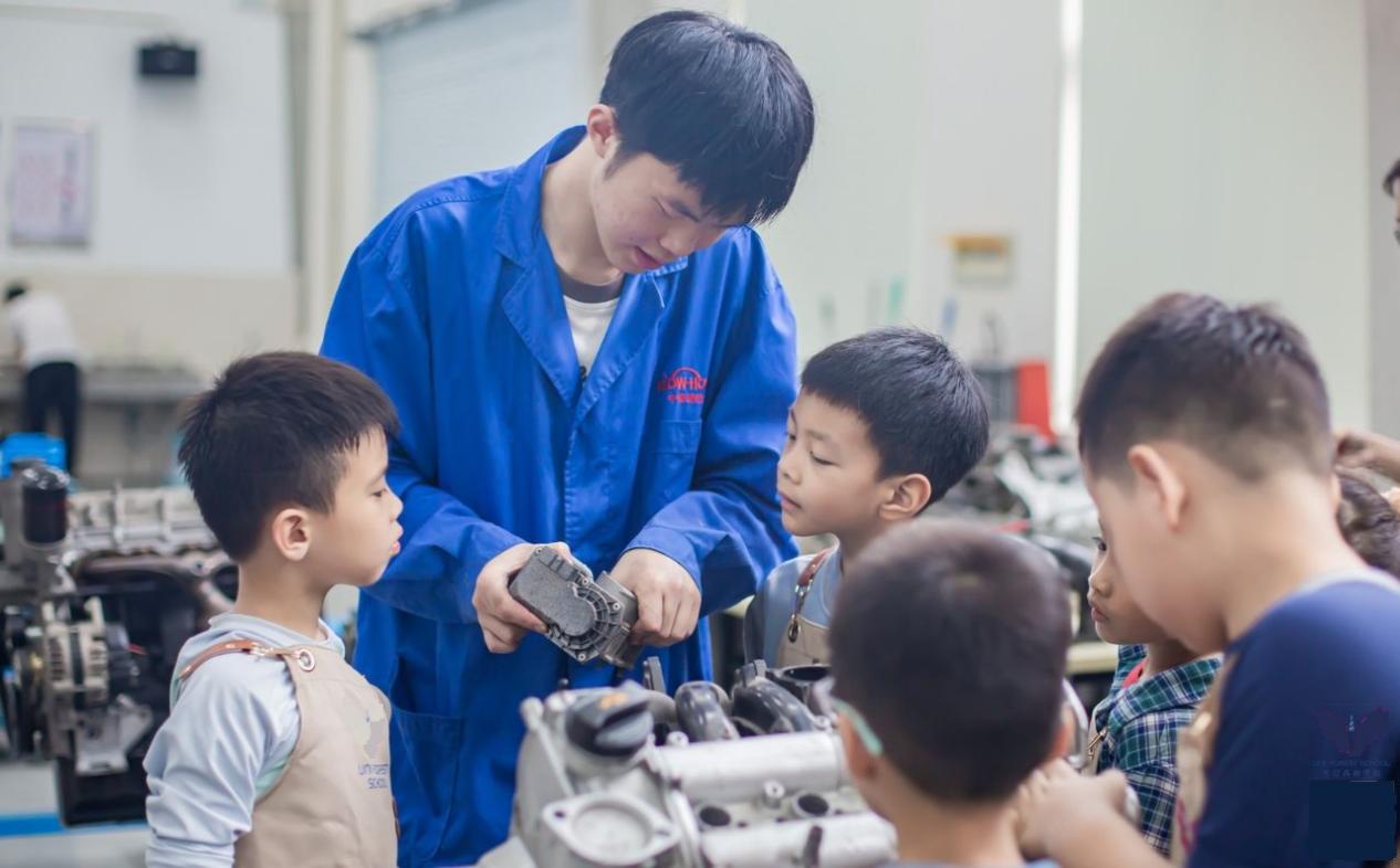 “世界上第一台汽车发动机是由德国工程师奥托在1867年发明的往复活塞式四冲程内燃机,这台发动机大大提高了热效率,并在1878年巴黎世博会上展出,标志着现代意义上的第一台发动机的诞生。”在信息与智能工程学院的汽车专业实训室内,宁城二手车社团的社员向小学生们介绍起了汽车发动机的发展历史。发动机是怎么工作的?现代汽车常用的发动机有哪几种?面对孩子们抛出的问题,汽车专业的教师和社员们现场一一解答,师生之间开启了一场有趣的科普互动。